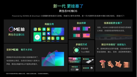本次司庆活动上,康佳65R6智慧场景屏成为主推产品,旨在以真实的视听体验,为消费者带来差异感的电视享受。R6系列搭载全新ME柚旗舰OS系统,既能实现百万APP无限安装,多任务系统随时切换海量应用,又拥有四种拼屏显示模式,可打造百种生活应用场景,实现同屏多窗多人共享互不干扰的自由拼屏,一边健身一边刷剧,一边游戏一边视频聊天等通通轻松实现;硬件上R6系列搭载第三代变频引擎四大变频技术,对声、光、色以及刷新率进行基于电流电路层面的智能调校,全新健康护眼、视听体验舒适且震撼。支持真4K满血120Hz高刷新频率,搭配VRR/ALLM/HDMI2.1/WIFI6等主流高配置及4K全程MEMC Pro和动态补偿帧技术,彻底消除运动抖动、运动拖尾现象,采用HDR实时转换技术,实现SDR到HDR画质的转变;搭载自主专利的全方位声场音响,释放环绕感更强、更保真的临场HIFI级音效等,软硬兼备,引领大屏客厅娱乐新时代。