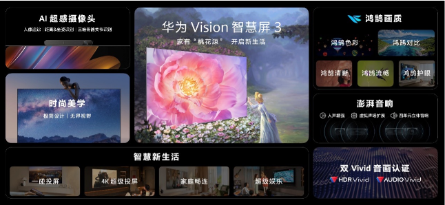 华为Vision智慧屏3配备的AI超感摄像头,搭配AI视觉芯片,可实现骨骼关节识别、人像追踪、坐姿/距离提醒等智慧功能1。华为自研的鸿鹄画质基于海量数据集深度训练学习,对11类画面场景智能识别,动态驱动色彩、对比度管理等算法模块调优,让美更有生命力。更有超级投屏功能,针对性解决用户投屏痛点,在手机端购买相应会员后还能一键4K投屏,革新用户投屏体验。作为一款更懂年轻人智慧需求的高品质大屏,相较于同级别产品,华为Vision智慧屏3还具有观影、K歌、健身、游戏等超级娱乐功能,让用户的生活不止一面。