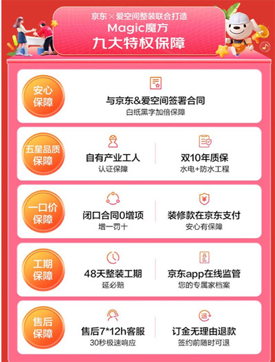 装修前期,消费者的装修意向金可7天无理由退款。在消费者与京东、爱空间签署三方闭口合同后,将匹配工长以及职业管家,其中工长负责各个环节施工,职业管家全程跟踪家装进度。每个装修环节结束后,消费者、管家、工长三方对该环节一起验收,通过后再进行下一个环节的施工,装修的每一步消费者都能了如指掌,清晰明了。