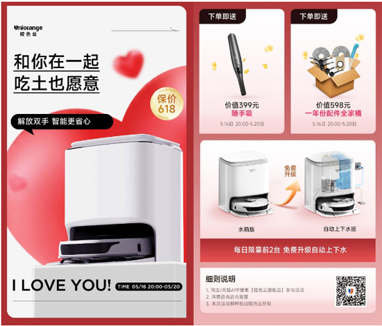 活动期间登录橙色云天猫旗舰店,购买橙色云i2智能扫拖机器人,可免费获得价值399元随手吸和价值598元的配件全家桶。此外每日前两单购买的用户还可免费升级自动上下水版本(若无条件安装可折现300元)。