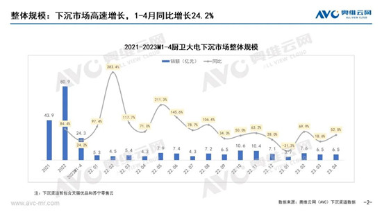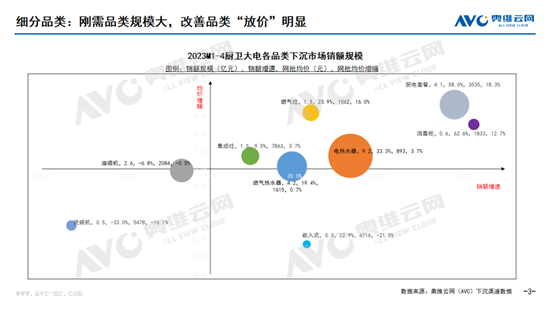从细分品类来看,下沉用户的需求主要聚焦于热水器、烟灶等刚需产品。据奥维云网(AVC)下沉渠道监测数据显示,2023年1-4月烟、灶、厨电套餐、电热、燃热合计销额规模21.4亿元,同比增长26.9%。