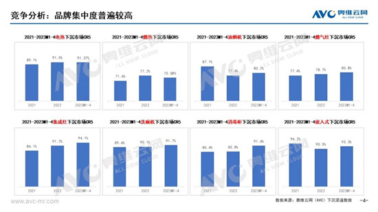 由于下沉市场消费者对品牌的认知程度不及一线城市高,因此消费者更加信赖具有较强实力、知名度和可以提供更好服务的企业。据奥维云网(AVC)下沉监测数据显示,2023年1-4月,电热、洗消嵌集的CR5超过90%,并且呈上升趋势。而烟灶、燃热的集中度也已超过75%,厨卫下沉渠道头部品牌集中度整体较高。因此,在开拓下沉市场的过程中,企业需要加强品牌营销和品牌建设工作,提升品牌知名度和专业性,为用户提供更好的产品和服务。