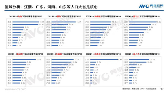 下沉市场的规模主要与人口相关。据奥维云网(AVC)下沉监测数据显示,2023年1-4月烟、灶、电热、燃热规模TOP10区域中,江苏、浙江、广东、河南、山东、安徽、四川7个地区重合出现,而河南、山东、四川、广东、安徽、江苏是乡村户数前10地区、浙江为第11名(第七次人口普查数据)。(戳→奥维数据罗盘)