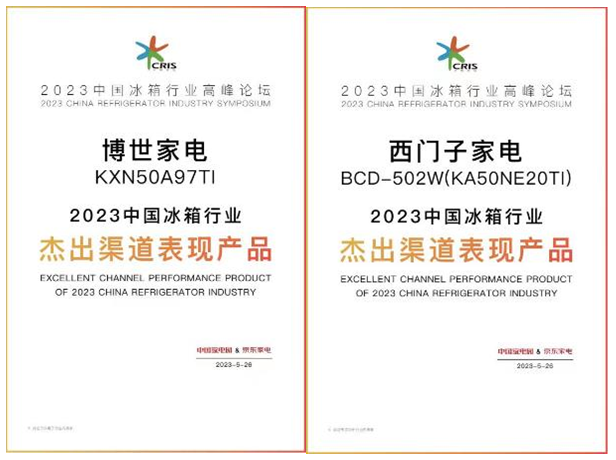 博世家电KXN50A97TI灰阶纤薄嵌入对开门冰箱和西门子家电BCD-502W(KA50NE20TI)对开门冰箱分别获评“2023中国冰箱行业杰出渠道表现产品奖”