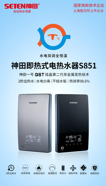 神田S851采用了“双芯双核硅晶加热+水电双调全恒温+溜背式亚克力面板+超大屏幕显示”的设计理念,产品竞争力远超目前行业内普通的即热产品。S851的诞生类似于苹果手机iPhone进入中国市场,iPhone让智能手机开始普及,S851将会引领行业普及水电双调全恒温技术。2023年,即热式行业很多品牌都加大了类似水电双调全恒温技术新品的研发速度。