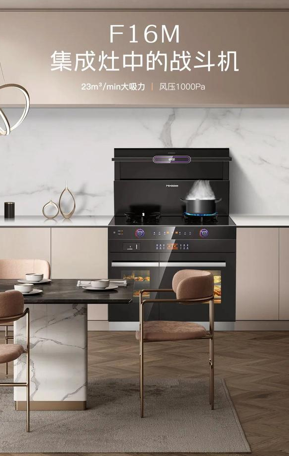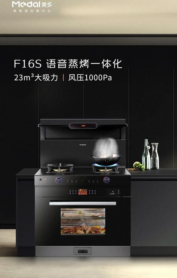 美多F16语音集成灶系列集油烟机、燃气灶、蒸烤箱、消毒柜、储藏柜等多种功能于一体,一机多用。不仅能够更好地满足日常家庭烹饪所需,相比普通厨电能节省更多空间。
