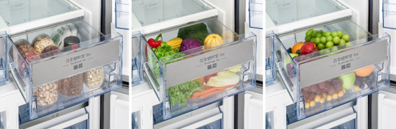 其冷藏区中特别设计有可三档变温的百变储鲜抽屉,以满足全家人多种多样的食材存储需求。不论是母婴食物,果蔬干货,还是太太的面膜,老人的中药滋补品,都可以找到最佳的存储状态。
