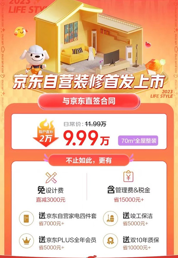 除了施工品质、装修服务保障,京东装修自营业务实打实地为消费者装修省钱。70平米新房全屋整装日常价11.99万元,京东618每户直补2万元,到手只需9.99万元。而这9.99万元里,还包含管理费、税金,而且还免设计费、赠送京东自营家电四件套、送竣工保洁、赠送京东PLUS全年会员以及双10年质保,整体能省45000元。