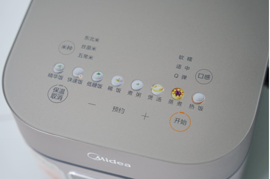 美的小赤炎电饭煲以雅士金覆盖全机身,整体是金属质感,科技感。现代感十足,属于目前年轻人钟爱的风格。面板是一整块纯平玻璃,不仅美观耐磨,清洁也更方便,污垢油渍一抹即净;按键面与很多品牌不同,是彩色带图画的,虽然指示更清楚,但总觉与淡金机身稍有违和,统一色调可能更有格调。