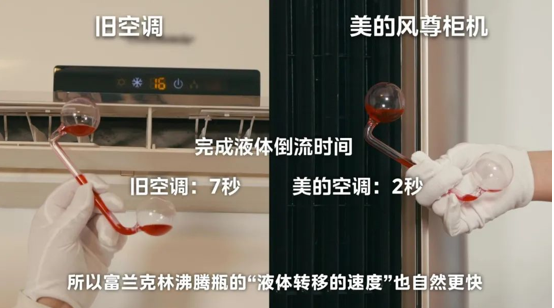 为了对比测试美的风尊柜机空调的制冷速度,我们准备了富兰克林沸腾瓶,测试时将会倾斜放置,让液体位于下方的球体。当顶部的球体温度下降,会导致气压减小,液体会由底部流入顶部,此时就会出现“神奇”的液体倒流现象。