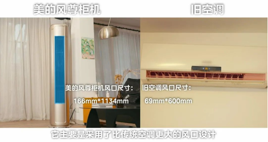 原因也很简单:首先,美的风尊柜机空调拥有7290W额定制冷量,远大于旧空调3500W额定制冷量,更适合大客厅。