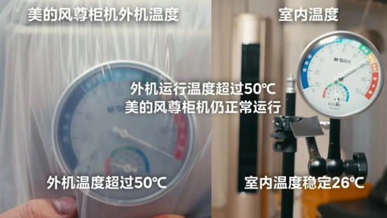 针对朱小姐反映的老空调高温不制冷问题,我们同样对美的风尊柜机空调的外机也进行了高温运行测试。