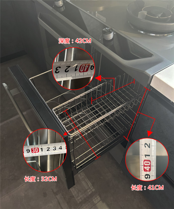 2、蒸烤箱 蒸烤炸是集成灶的标配。常规集成灶的蒸烤箱因为后面放置风轮,整体呈现为长方形,延展长度来达到大容量效果,苏泊尔集成灶AQ80T调整结构以后,整体结构更接近专业的蒸烤箱,深度达到了42cm,整个体腔的热力更均匀,烹饪效果更好。