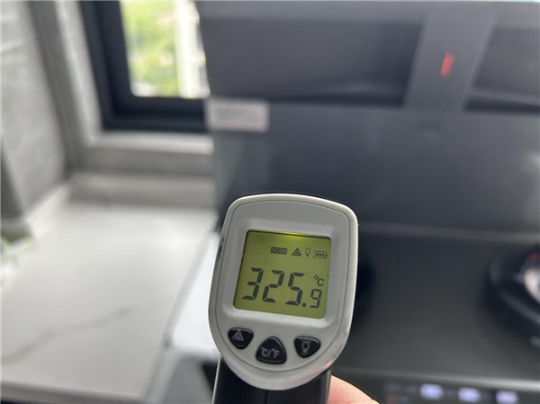 经现场红外线进行火焰温度的测量,开启灶具后,仅需几秒,大火情况下温度可以达到300℃以上。