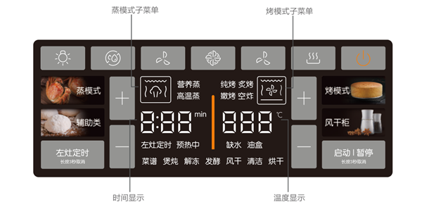 智控区进行了角度调整,16°倾角设计更加适配国人的使用习惯,让视觉、操控动线都更符合人体工学,双手所及之处即可操控烟、灶、蒸、烤、炸、消等所有功能。