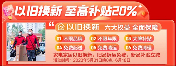 为了确保废旧家电家居产品得到正确的处理,让绿色环保落到实处,早在2016年,京东就针对家电品类上线“以旧换新”服务,并先后上线了包含大小家电在内的超过100个细分类目。截至今日,京东家电家居的以旧换新服务,已经覆盖全国95%以上城市/乡镇等地区。同时,基于消费者诉求,京东在2023年率先在床垫、马桶等家居商品品类开通以旧换新服务,并提供免费上门拆旧清运服务,再次领先行业。通过推广和普及以旧换新服务,使闲置的废旧家电家居产品得到妥善处理,让旧物能够得到妥善处理,在避免了环境污染的同时,还能获得以旧换新补贴,更大地激发用户的购买力,促进循环经济的发展。值得一提的是,今年618京东家电家居升级以旧换新服务,为消费者带来不限品牌、不限年限、大牌补贴、免费配送、免费清运、免费清理六大权益,让消费者以旧换新更省心。