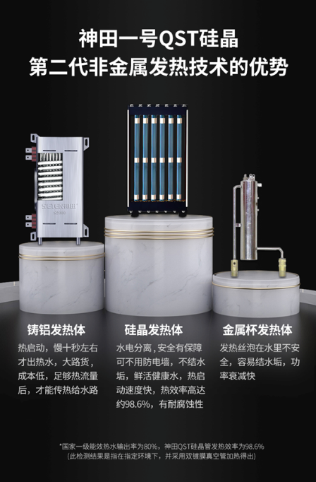 第一,综合性能更优。神田一号QST硅晶第二代非金属发热技术,水电分离,不结水垢,热启动快,2秒出热水,8秒可以实现恒温,热效率高达98.6%,耐腐蚀,稳定性好。相对而言,铸铝发热体的热启动会慢,达到恒温效果可能要到20秒以上,热效率也更低。