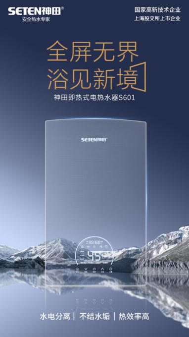 神田S851采用了“双芯双核硅晶加热+水电双调全恒温+溜背式亚克力面板+超大屏幕显示”的设计理念,产品竞争力远超目前行业内普通的即热产品。