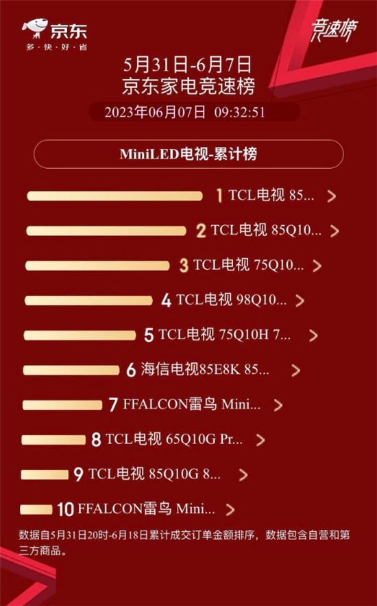 然后我就搜了一下京东今年618的Mini LED电视销量排行榜,没想到TCL竟然这么强,排名前十的电视竟然有九款都是TCL的,这确实有点惊到我了。群众的眼睛是雪亮的,大家都选择的产品一定差不了,所以我也就选择入手了销量排名第一的TCL Q10G Pro。