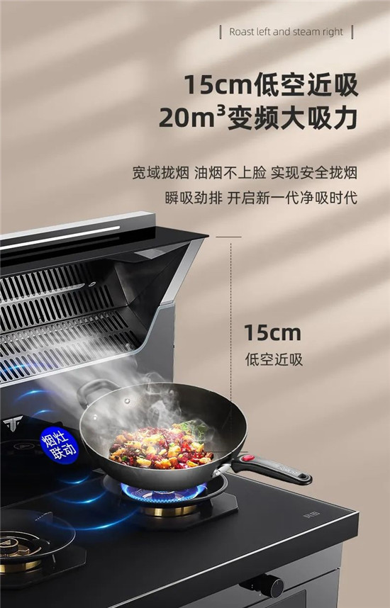 特别是风田T9AS-M,烟源位置到挡烟板仅15cm,低空近吸配合宽域拢烟,让油烟不过脸,厨房更健康!