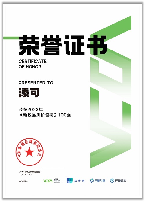 今年4月,添可凭借突出表现,成功入选由VCON新锐品牌展发布的2023“新锐品牌价值榜TOP100”。不同于其他奖项评选标准,此榜单更强调消费者及用户的评价,例如用户互动力,用户认知、喜好、购买行为及推荐度等,因为这些“细活”更考验品牌的定力与功力。