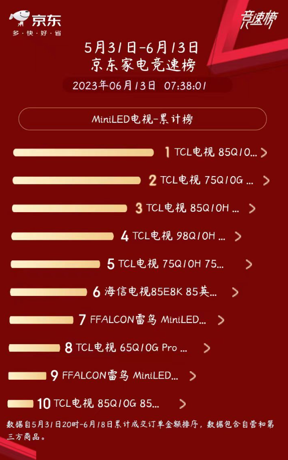 随着逐渐进入6月中旬,一年一度的618年中购物节也已经过半,相关家电产品的销量榜单也是又一次让我们对于这些产品有了更为深刻的了解。在Mini LED电视方面,京东家电竞速榜中显示排名前十的电视产品中,九款都是TCL相关的Mini LED电视,堪称屠榜,产品爆发力让人不得不佩服。