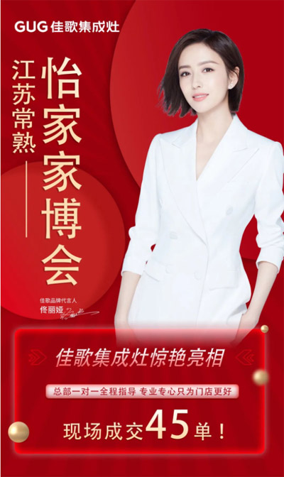 昨日,江苏常熟怡家家博会圆满落幕,作为特别邀请参展单位,佳歌集成灶惊艳亮相,并以45单的好成绩勇夺本次展会集成灶单品销量冠军!