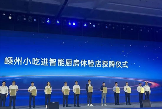 在本次大会上,作为集成灶领军企业之一的蓝炬星被授予为嵊州小吃入驻智能厨房体验店指定企业,由嵊州市人大主任孙海荣、政协主席柴理明共同授牌。