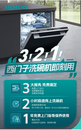 捕捉到消费者对洗碗机产品的青睐,在楼市“金三银四”后的家装旺季,西门子家电特举办全国洗碗机节活动,推出“3,2,1”即刻用服务:3指3大免费服务,免费上门设计,免费橱柜改造,免费机器安装;2指2小时快速安装;1指1年免费上门指导保养使用,基本上解决了洗碗机安装的后顾之忧。