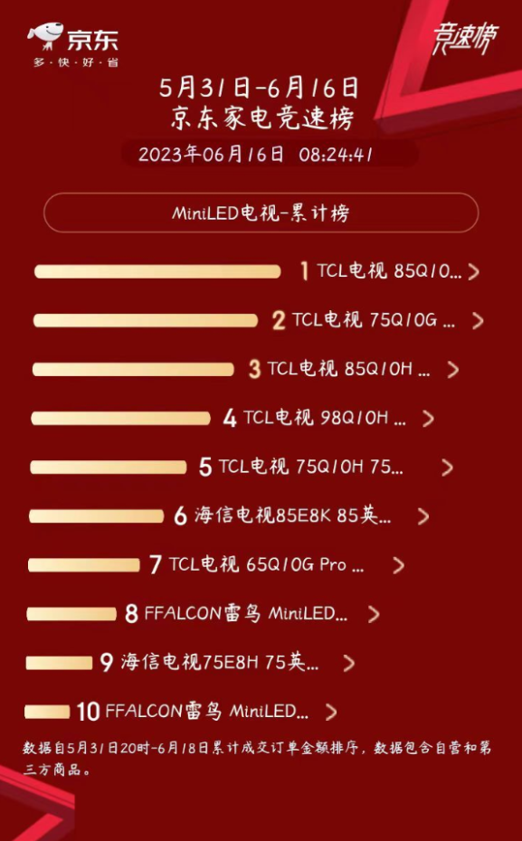 像是在618期间的京东家电竞速榜Mini LED电视的家电趋势单品排名中,排行前10的电视型号,有8款都是TCL的电视产品,这一方面展现出了TCL电视在Mini LED领域的绝对领导力优势,另一方面也展现出了消费者对于TCL的认可。