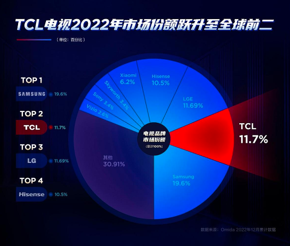 2022年TCL智屏全球出货量达2378万台,同比逆势增长0.8%,出货量市占率跃升至全球第二,其中中高端产品TCL Mini LED智屏全球出货量同比增长26.8%,并且在中国市场零售量以绝对优势蝉联市占率第一。