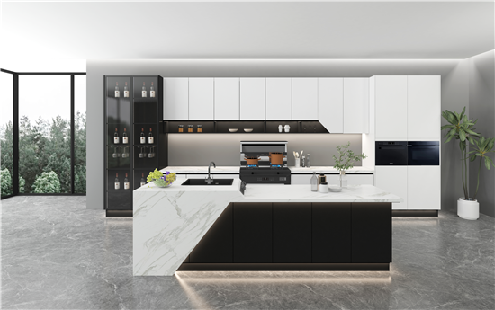 柜体门板采用了丽博亲肤板,自带高级的亲和力,触感如婴儿的肌肤般轻柔、温和。搭配黑色铝框+黑玻的高柜,一柔一刚,一深一浅,平衡之下让厨房整个收纳+展示空间更加有层次,视觉上也更有冲击效果。柜体内升降机的融入,让吊柜触手可及。