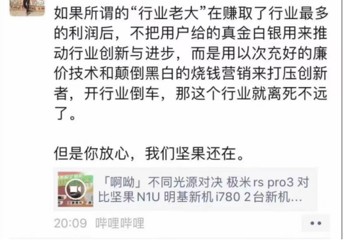 在5月29日,坚果CEO王骁逸的朋友圈图片流出:“如果所谓的‘行业老大’在赚取了行业最多的利润后,不把用户给的真金白银用来推动行业创新与进步,而是用以次充好的廉价技术和颠倒黑白的烧钱营销来打压创新者,开行业倒车,那这个行业就离死不远了。”