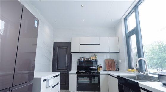 从事平面设计工作的姜女士,在房子装修时非常有想法。综合一家六口人不同年龄的喜好,一楼是长辈们喜欢的新中式风,二楼则是年轻一辈更偏好的白棕色系简约风。而位于二楼的厨房一方面为统一风格色系,一方面因为面积较小,因此整体以白色橱柜为主,让厨房更加明亮,具有通透感。