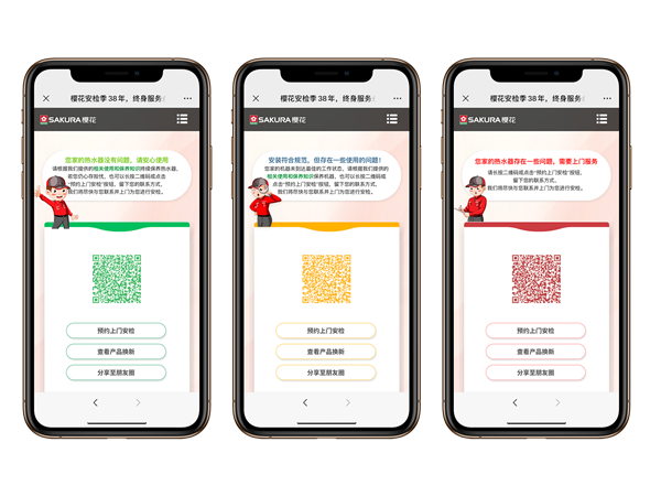 同时可通过拨打SAKURA樱花全国服务热线400-166-6668、登录SAKURA樱花官网服务页面或进入微信公众号预约安检服务。今年“SAKURA樱花”微信公众号更贴心设立了“安检门诊部”,用户通过参与线上“云安检”获取家电体检报告,若出现红码或黄码,可预约樱花服务人员上门安检,进一步排查隐患。不仅如此,参与“云安检”还有机会获得樱花燃气热水器及更多惊喜好礼!