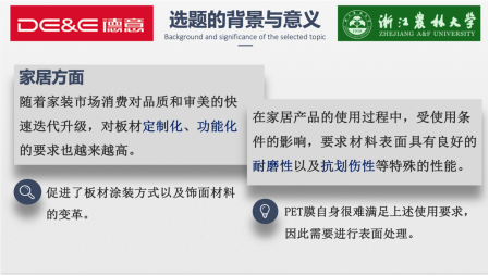 本次开题会议上,曲丽洁博士对PET材料现阶段的性能与其当前应用于家居领域的背景和研究意义做了说明。随着家装市场消费对品质和审美的快速迭代升级,对板材定制化、功能化的要求也越来越高。在家居产品的使用过程中,受使用条件的影响,要求材料表面具有良好的耐磨性以及抗划伤性等特殊的性能。