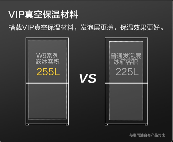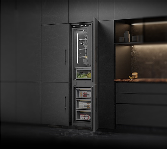 深度洞察国内市场用户家庭需求,600mm左右深度的橱柜是目前比较普遍的选择,嵌入式冰箱的尺寸设计需要考量到与橱柜的适配性,在冰箱深度、箱体厚度与容量间达到平衡。惠而浦W9系列嵌入式冰箱深度仅有546mm,单台占地面积约为0.3㎡,可以与市面上大部分橱柜相匹配,让消费者轻松打造理想厨居。W9系列嵌入式冰箱搭载VIP真空保温材料,发泡层更薄、导热系数降低,不仅实现更好的保温效果,赋能食材保鲜,还提升容积率,255L容量比普通发泡层冰箱容积多出约30L(*与惠而浦自有产品对比),消费者可依据喜好自由选择左右开门、冷藏冷冻款式数量,组合更大容量储鲜室,满足多样化储存需求。