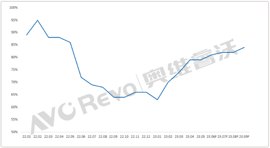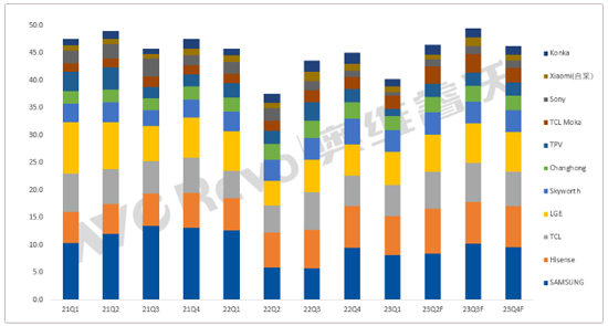 由于下半年是海外的传统销售旺季,在面板持续涨价的预期下,整机厂不得不持续增加采购,甚至将原本Q4的需求提前,预计TOP11整机厂23Q3的面板采购计划达到49.5M,已经恢复到高位。