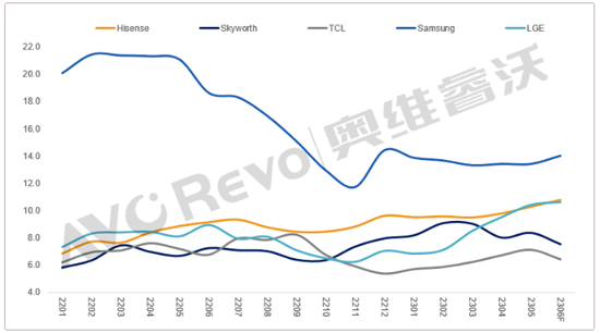 在当前市场需求低迷情况下,整机厂Q3采购计划激进,其存在的风险也将被放大。当整机厂销售的压力逐渐传导过来,企业库存的状况将逐渐被重视,根据奥维睿沃数据,三星电子虽然库存周数相比一年前有明显的下降,但是其自身库存规模庞大,因此其调控的空间较大;LGE/Hisense今年以来一直超额采购,库存持续增加。根据《AVC产业链--全球电视整机厂PSI数据报告》,6月底三星电子企业库存周度14周,LGE/Hisense也超过10周。
