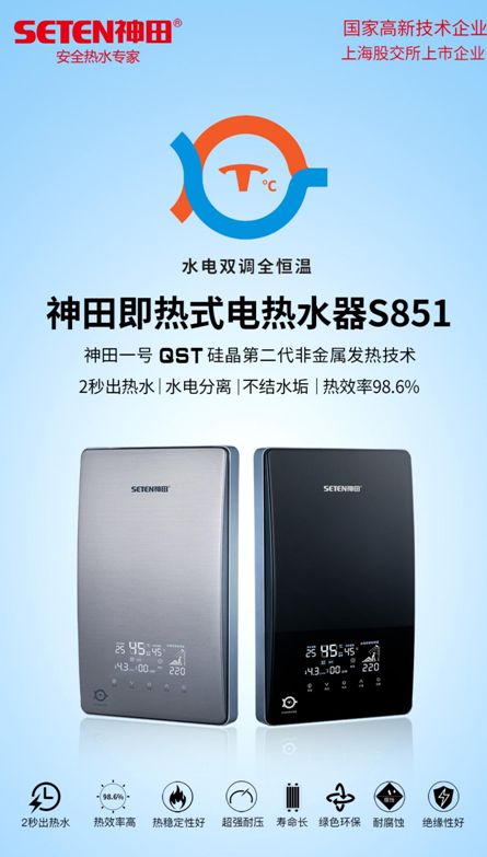 神田高端产品S851采用了“双芯双核硅晶加热+水电双调全恒温“的产品平台,与同行相比,技术差异化优势明显,产品竞争力远超目前行业内普通的即热产品。