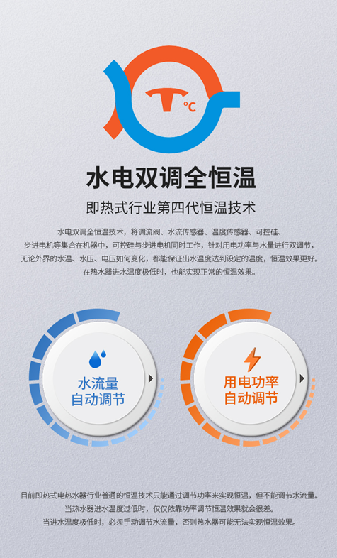 水电双调全恒温技术,可以同时自动调节用电功率与水量,无论外界的水温、水压、电压如何变化,都能保证出水温度达到设定的温度,恒温效果更好,水量与水温也更精准。