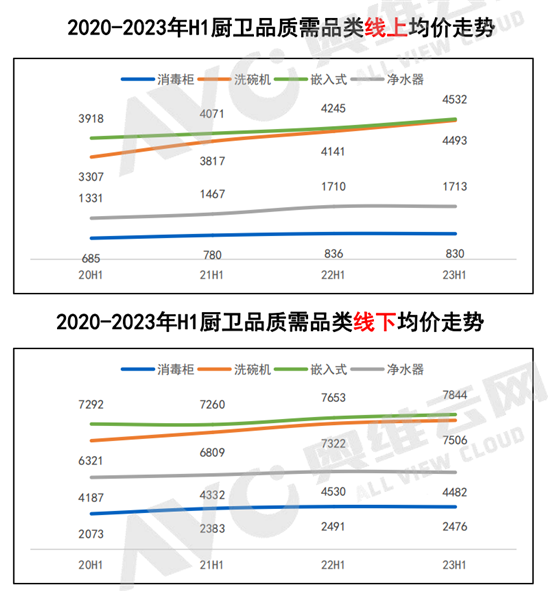 另一方面值得注意的是,品需家电已经出现了明显的产品结构升级。相较于往年,2023年上半年品需厨电线上均价几乎都处于上升态势,特别是洗碗机品类,均价4532元,相较于2020年上半年的3918元,上升了约15.7%;净水机相较于2020年上半年,今年1713元的均价则上升了约28.7%。 线下市场品需厨电均价的基数相对比要高出不少,因此上升幅度不如线上市场,但上升价格却也超过了线上市场。特别突出的就是洗碗机品类,今年线下均价7506元,相较于2020年上半年均价上升了约18.74%。