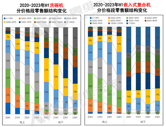 在渠道方面,品需厨电完全符合线下拥有更多高端家电和品质家电需求的“刻板印象”——2023年上半年,线下洗碗机零售额占比达到58.5%,相较于22年全年数据提升了5.5%,高于2020-2022年各年;嵌入式线下零售额占比68.7%,高于22年全年的66.4%,但相较于2019年的76.9%还是有一定差距。