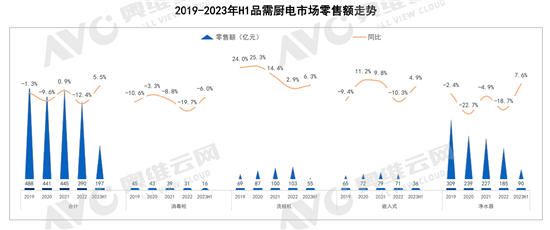 但是在2022年,洗碗机增速又逐渐放缓,形成了“V”型托底走势。而洗碗机以外的消毒柜、嵌入式和净水机的零售额则直接下滑,直到今年上半年零售额增速才重新扭正!
