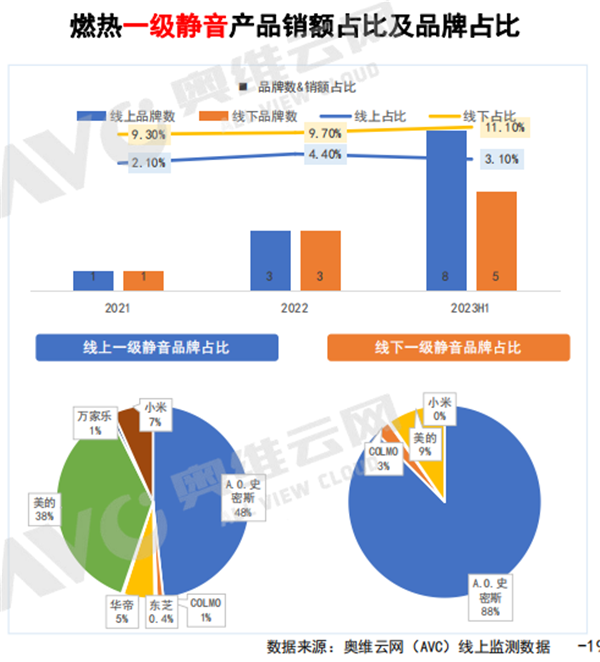 静音同样是主要趋势之一。燃热一级静音的入局品牌显著增多。一级静音产品线上同比增加3.10%,线上品牌数同比增加11.1%,A.O.史密斯在静音领域可谓是一家独大,线上占比近五成,线下占比近九成。