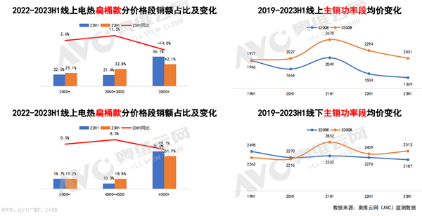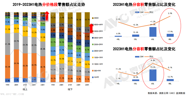 价格段方面,线上市场2000-2499元价格段和3500元以上价格段呈现增长趋势;线下市场4000元以上价格增长显著,其中,6000元以上价格段零售额占比达到19.1%。线上16L和18L均价同比增长5.2%和11.3%,助推价格提升。