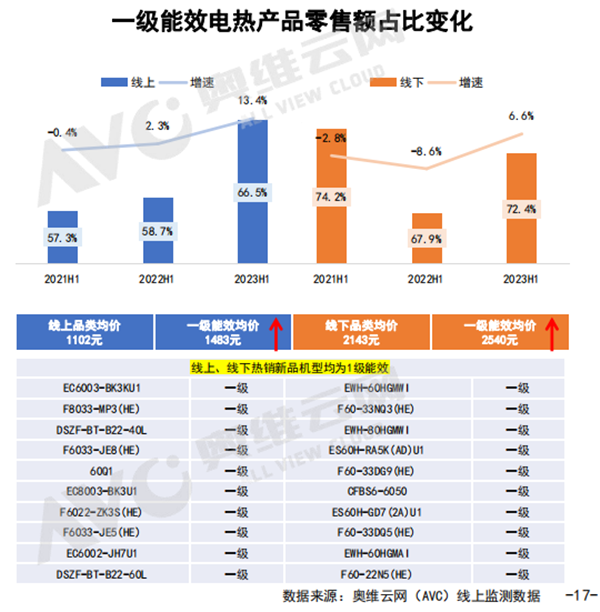 随着“绿色低碳,节能环保”的理念深入人心,能效也成为消费者选购的重要因素之一。据奥维云网(AVC)数据显示,电热、燃热一级能效占比均有所增长,一级能效电热产品线上零售额占比66.5%,同步提升13.4%,均价提升至1483元,线下零售额占比72.4%,同步提升6.6%,均价提升至2540元。