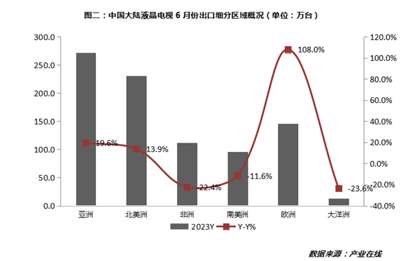 6月份出口870.3万台,同比增长12.9%,出口额119738.6万美元,同比增长17.4%,出口额的增幅首次反超出口量增幅。本月度出口的增长主要靠欧洲市场的拉动,出口量达145.6万台,同比翻番;但是在量值上依然是亚洲和北美洲占据主导地位,分别出货271.8万台和231.2万台,分别同比去年增长19.6%和13.9%。累计1-6月份来看,出口到亚洲市场是1436.9万台,同比基本持平;北美洲和欧洲是拉涨主力,分别是1276.1万台和842.7万台,同比增长26.0%和42.4%;非洲和南美洲分别出货665.9万台和430.4万台,下滑在10个点以内,大洋洲出货仅83.1万台,同比去年下滑30.3%。