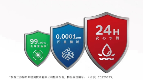 博世嵌入式净饮机全水路采用抗菌材质,能有效抑制细菌滋生,可有效避免自来水在净化过程中被二次污染,“安心水路”的第1重盾护为全家饮水健康提供了24小时长效护航,让每一滴水更洁净安心。而为快速将自来水净化为可以直接饮用的纯净水,产品搭载了原装杜邦反渗透滤芯,搭配多合一复合滤芯,可凭借第2重盾护“四重精滤”,将水中重金属、细菌等有害物质去除,净化效果可达0.0001微米1;同时在四重精滤之一的活性炭棒支持下,还能进一步改善水的口感。第3重盾护“去除重金属”则凭借双滤芯相互配合,可实现99.99%2的重金属、挥发性有机物的去除率,为居家饮水提供更健康安全的解决方案。