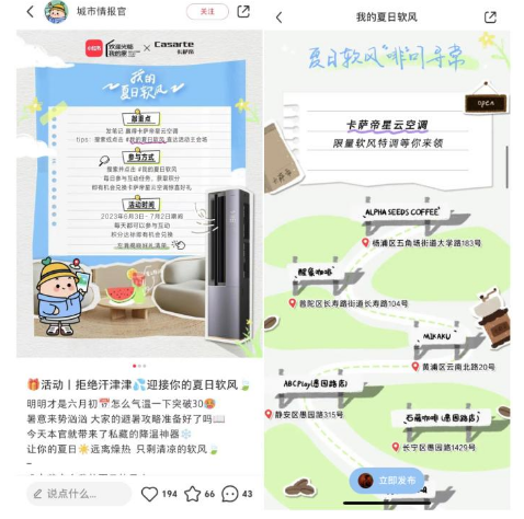 本次IP活动由小红书官号 城市情报官发起,卡萨帝星云空调通过咖啡馆核心区域的产品融入、定制打卡框、定制杯套等丰富植入,门店场景深度融入了星云“软风”元素。同时一波活动还打造了二次营销,到店发布打卡笔记,即可获得一杯卡萨帝星云空调软风特调咖啡的互动玩法,更是有效刺激了用户参与。